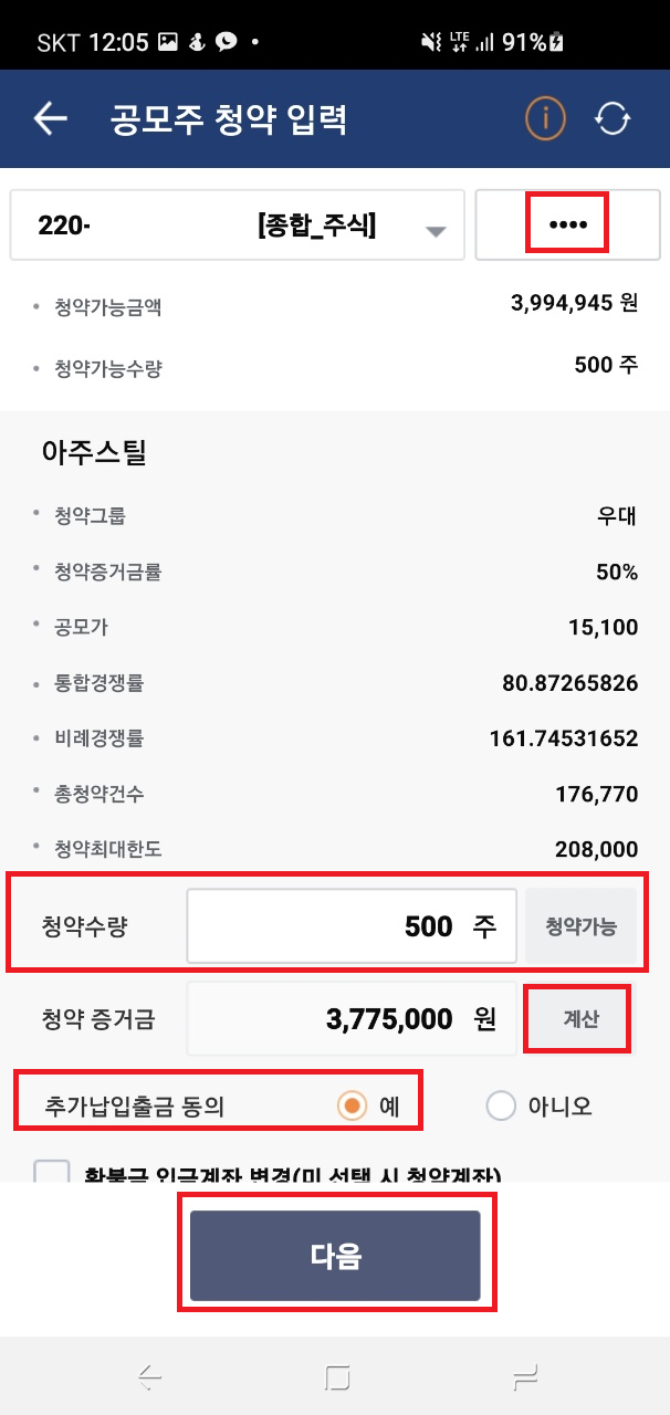 (3) "청약수량"에 최대 수량을 입력하고, 밑에 "청약 증거금" 항목의 "계산"을 누르면, 자동으로 청약 증거금이 계산된다.