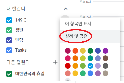 화면 좌측 "내 캘린더"에서 공유할 구글캘린더를 우선 정합니다.
