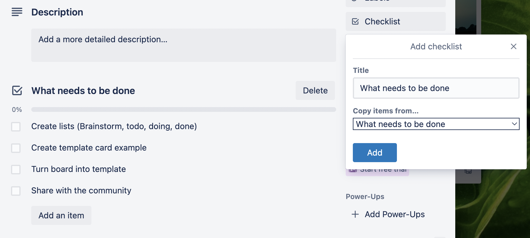 위 "Power-ups"의 "+Add Power-up" 메뉴를 통해 추가 기능을 활용할 수 있는데,