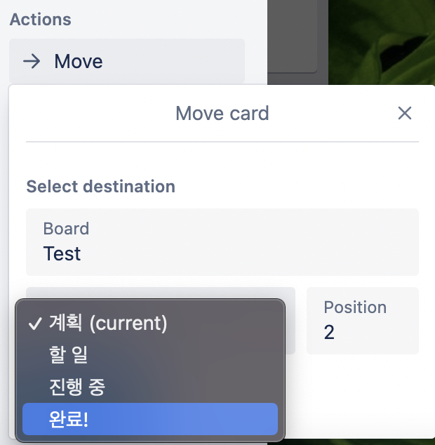 "Move" 또는 "Copy"는 본 과업(카드)을 다른 메뉴(카테고리)로 보내거나 복사할 때 사용합니다.