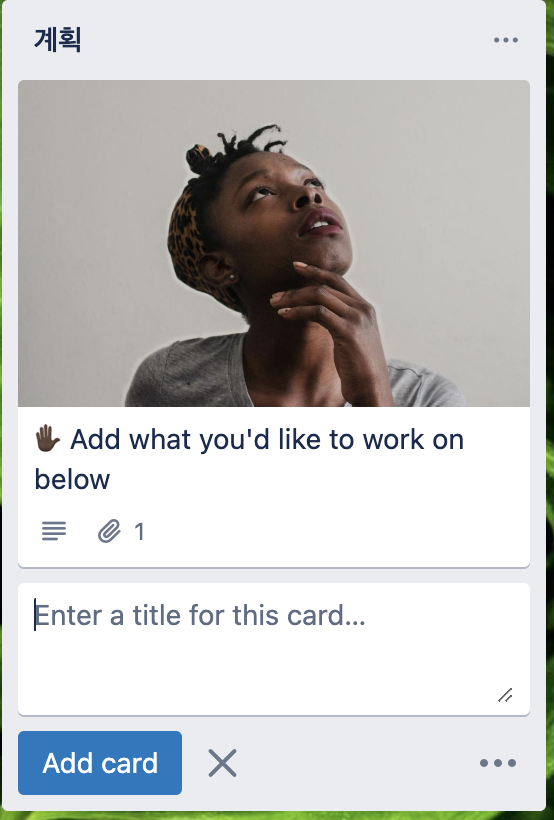 그럼 "Enter a title for this card..." 부분에 과업의 제목을 입력하고, "Add card" 배너(파란색)를 클릭합니다.