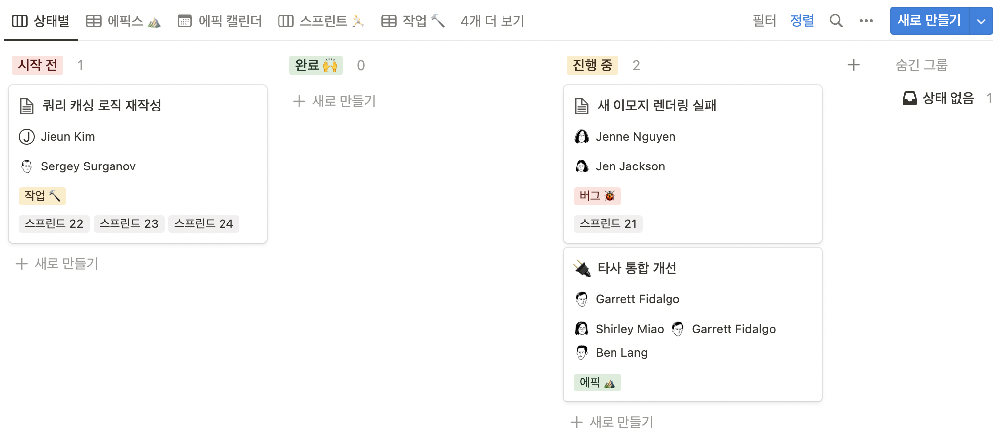 정렬 상태를 보시면, "완료"가 왼쪽 그리고 "진행 중"이 오른쪽에 있는데, 업무 프로세스 기준으로 봤을 때 둘의 순서가 바뀌어야 할 거 같군요. 그래서 "완료"를 마우스로 클릭&드래그 하여 "진행 중"이 있는 위치로 이동해 줍니다. 그럼 아래 그림과 같이 두 상태(그룹)가 서로 위치가 스위치 된 것을 확인할 수 있습니다.