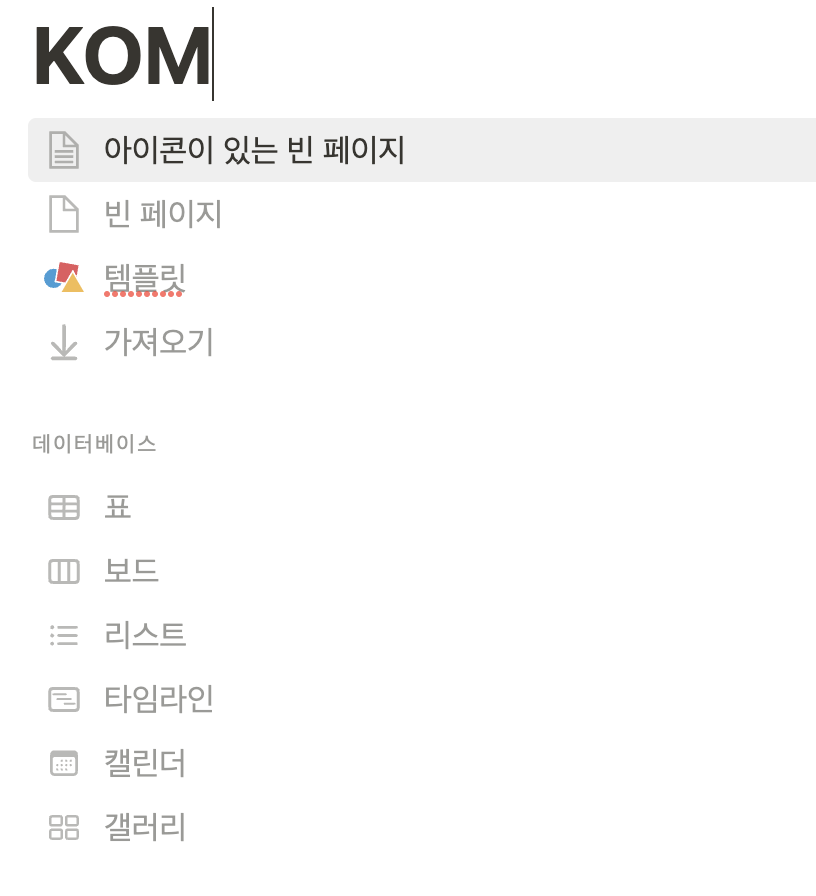 이 중에서 "페이지"를 클릭해서 "KOM"이라는 이름의 하위 페이지를 만들어 보겠습니다.