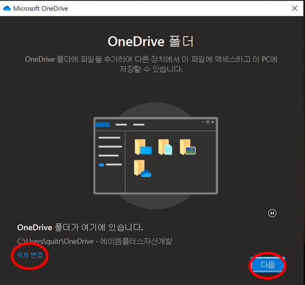 6. 아래 그림 창이 열리면, OneDrive 폴더 설치 위치 설정