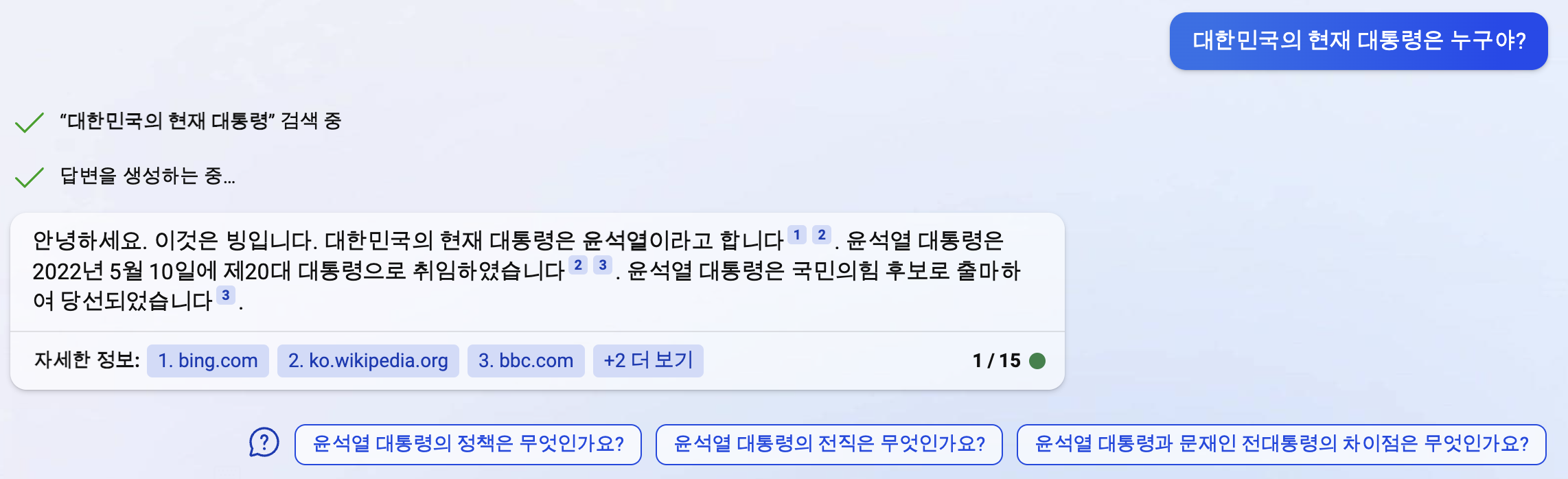 그래서 찾다보니, MS의 검색엔진 빙(Bing)의 경우 챗지피티(ChatGPT)의 현재 기준 결과를 도출해 낼 수 있다는 소문을 듣고 시도해 봤습니다.