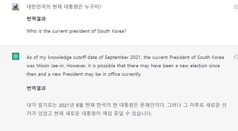 챗지피티(ChatGPT)의 "영어" 답변을 다시 (파파고 등을 통해) 국문으로 번역해서 결과를 확인하게 되는 것이죠.