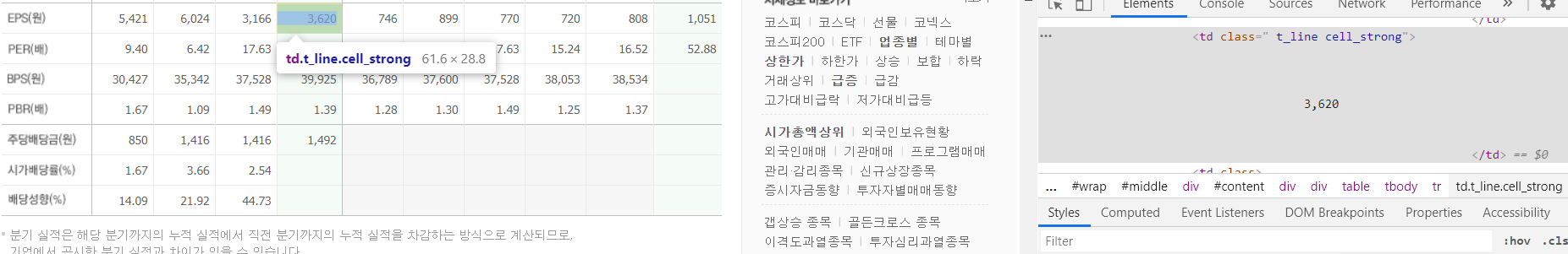 삼성전자의 네이버금융 웹페이지 예상 EPS data의 xpath*를 확인합니다.