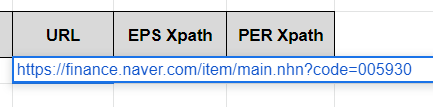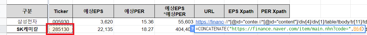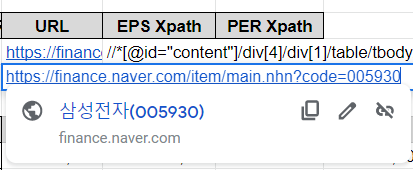 그래서 위 삼성전자의 EPS Xpath 값과 PER Xpath값을 SK케미칼 항목에도 그대로 복사해서 붙여넣습니다.