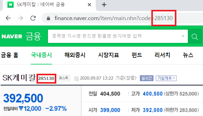 URL의 마지막이 SK케미칼 종목번호인 285130으로 끝나는 것을 확인할 수 있습니다.