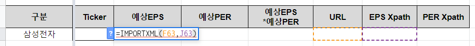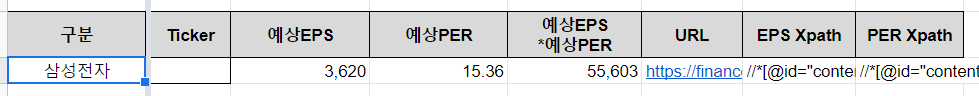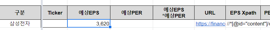 해당 종목의 "예상EPS*예상PER" 값을 자동으로 불러올 수 있게 되는 것입니다.