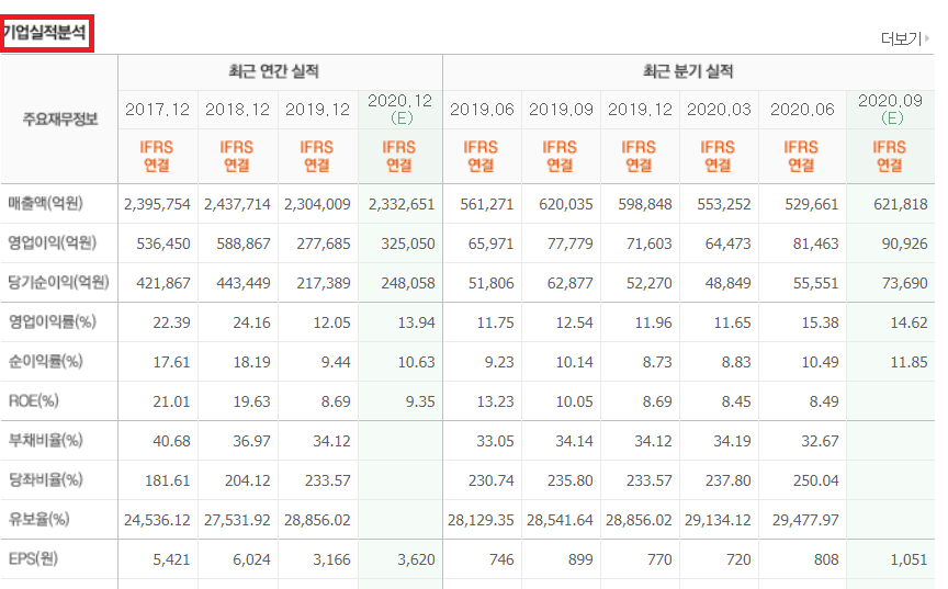 아래의 EPS와 PER(2020년 올해 연말 예상치)입니다.