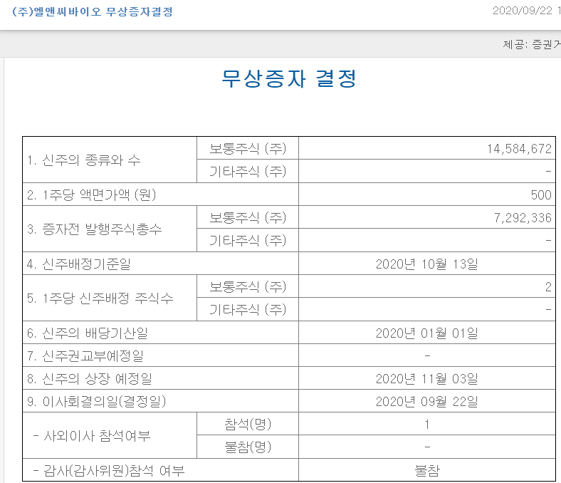 지난 9월 22일 엘앤씨바이오가 "무상증자"를 한다는 공시가 발표됐는데요,